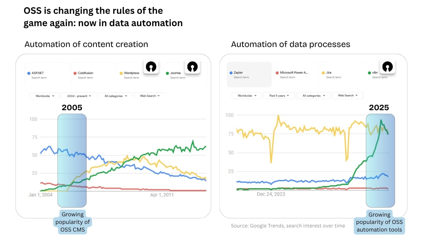 Automation is fast becoming a “commodity” - just as websites and content creation platforms were 20 years ago. In the mid-2000s, open source framework Joomla (later WordPress) turned websites and internet platforms from a luxury to a necessity: whereas in the early 2000s a programmer was required to create simple web platforms and designs, by the mid-2000s anyone could create them in just a couple of hours. The same thing is happening now with the automation of business processes thanks to tools like n8n. What used to take days of coding is now available to everyone, not just IT, and is often created in minutes by business users themselves.