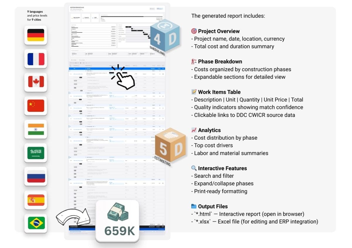 DDC CWICR (Construction Work Items, Components & Resources) is an open database for construction cost estimation, covering the full spectrum of construction activities—from earthworks and concrete placement to specialized installation work.