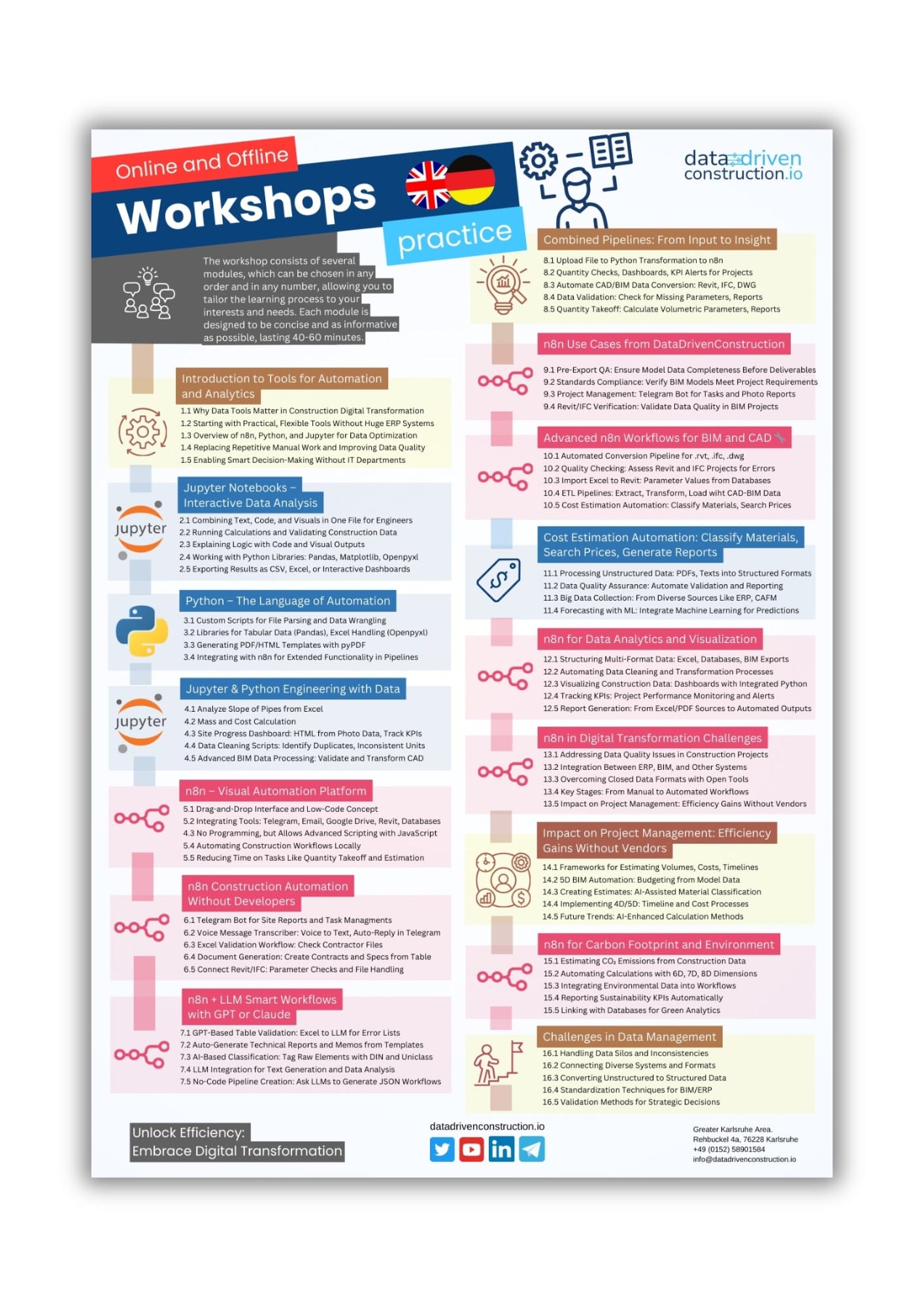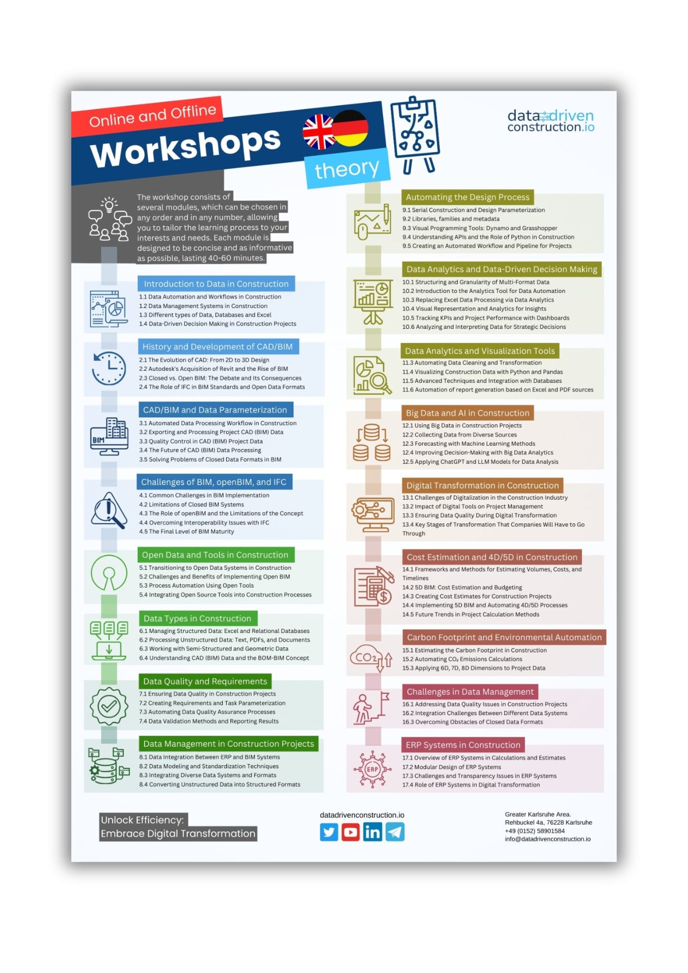 DataDrivenConstruction offers workshops tested and practiced on global leaders in the construction industry to help your team navigate and leverage the power of data and artificial intelligence in your company's decision making.